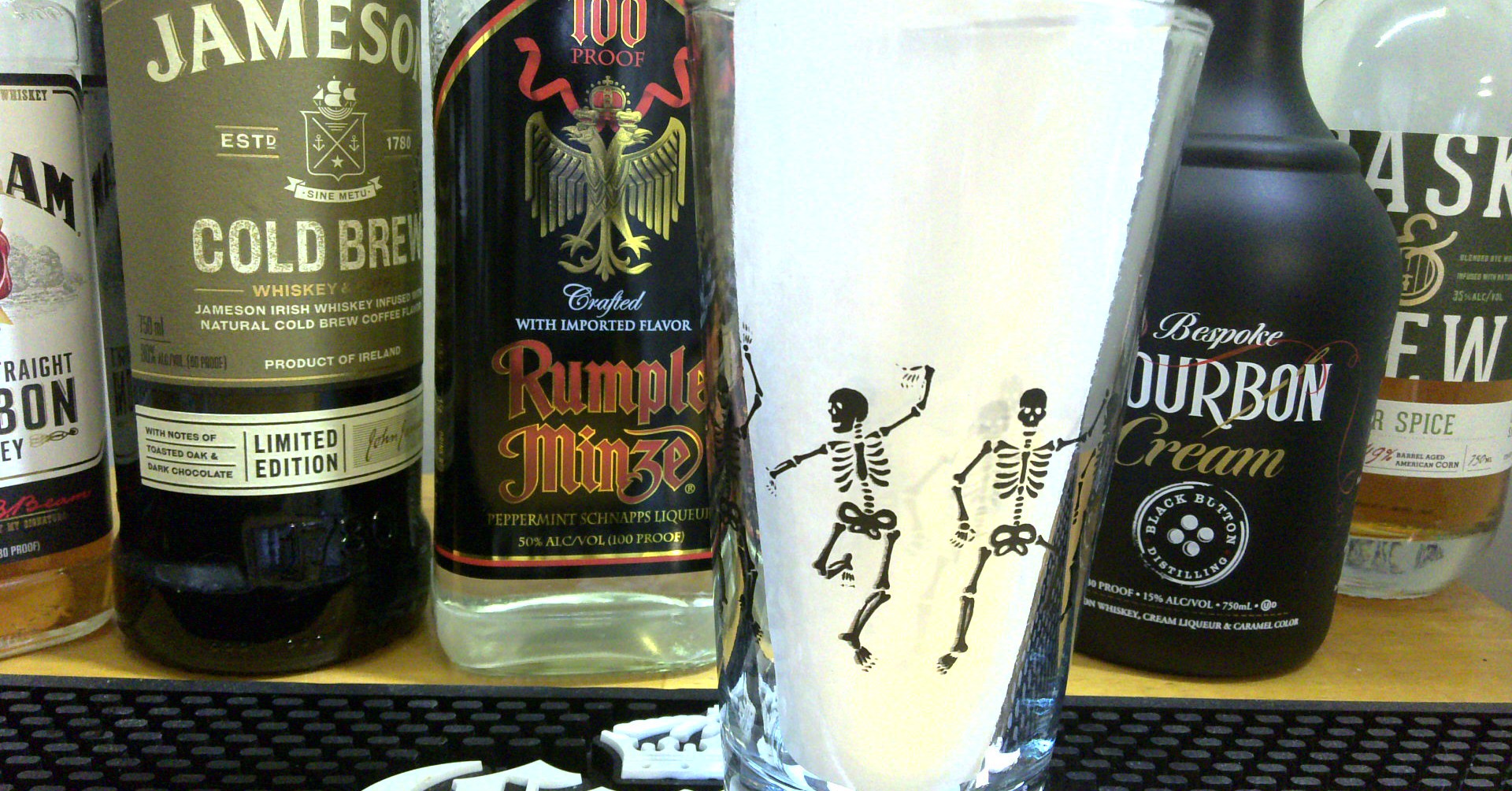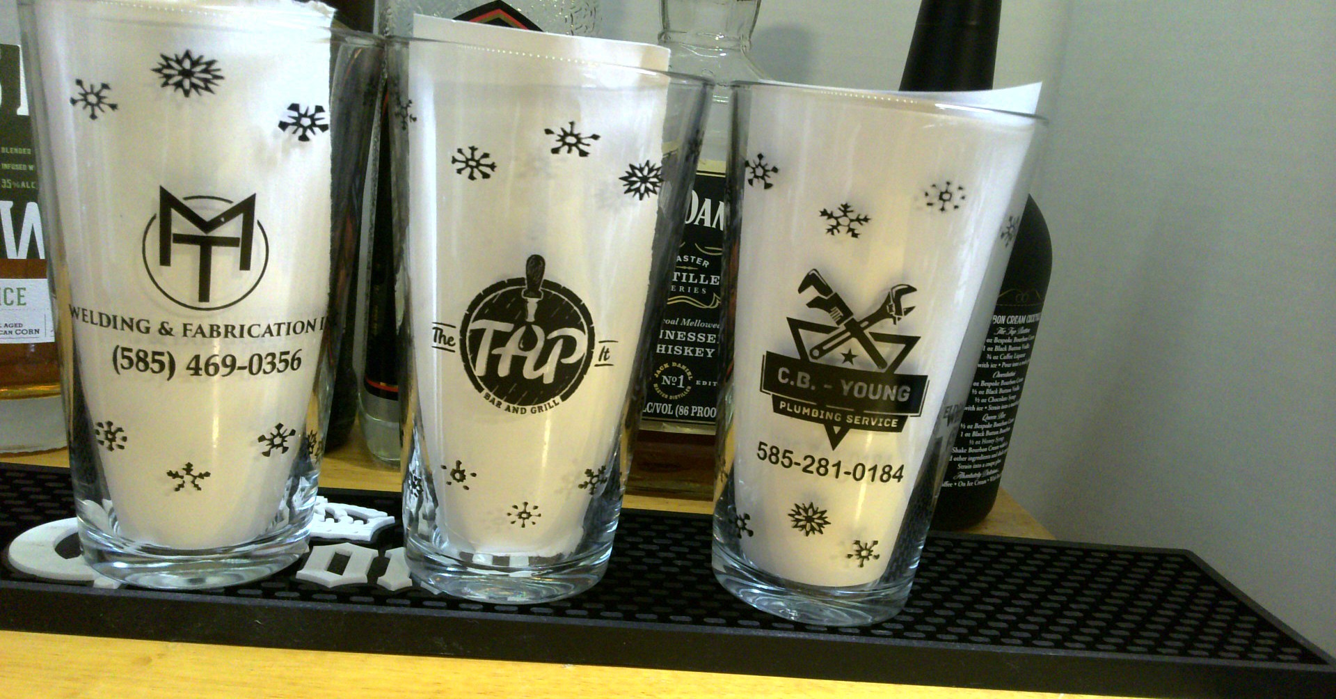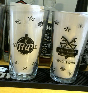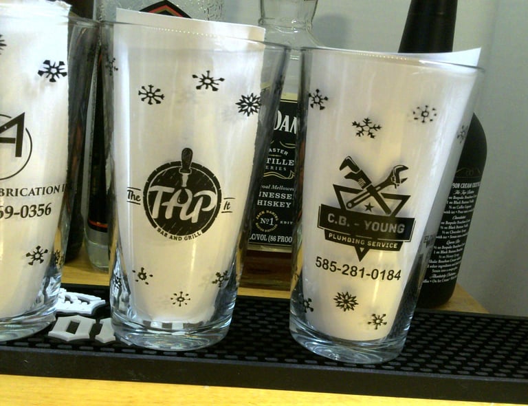 Custom screen printed glasses for bars for free, with local business advertising.